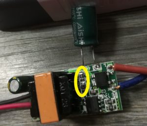 Budou to rezistory s hodnotou „104“, tedy 100 kOhm. Vypájíme je a na jejich místo umístíme nové s hodnotou 4K7 („472“). LED driver zase složíme do krabičky.